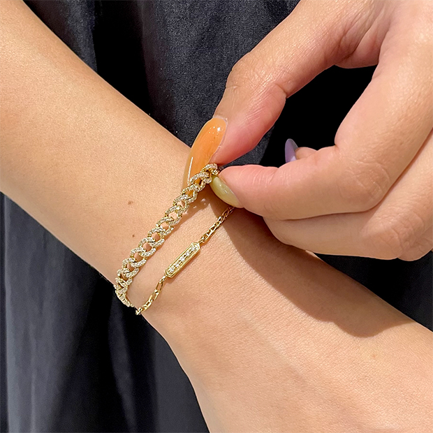 ジョイント部分にはダイヤモンドをセッティングしたバーをあしらって、より存在感のあるブレスレットに。